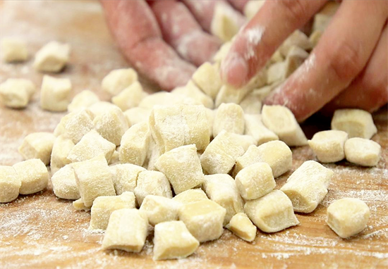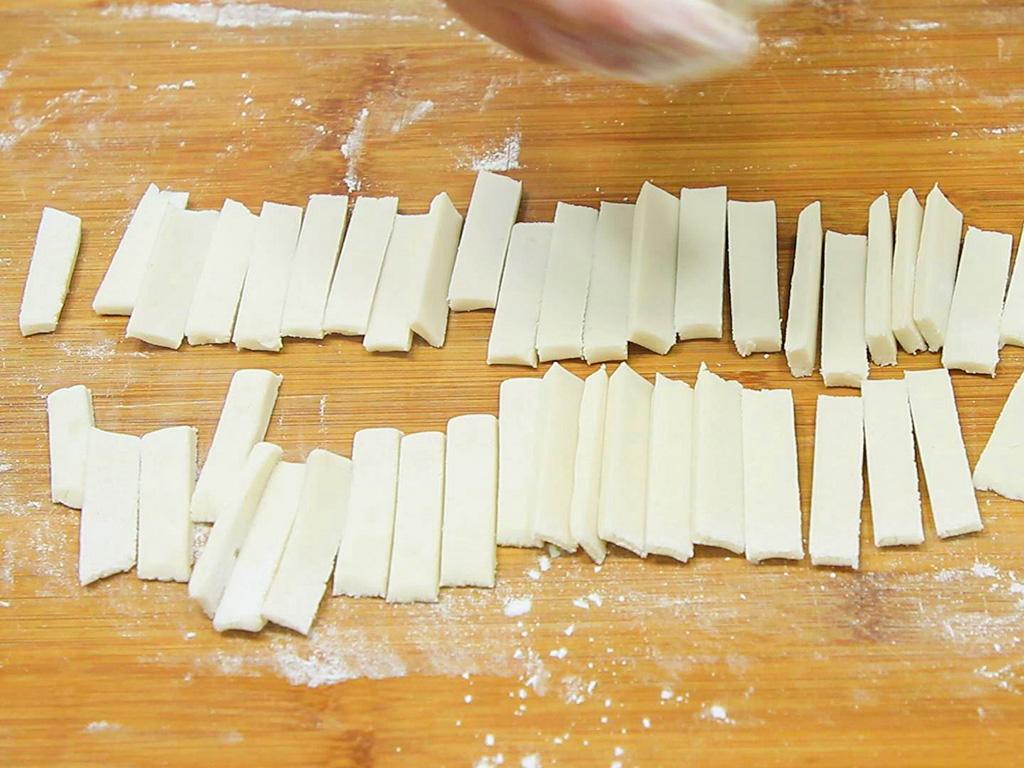 3.10分钟以后在案板上撒上一点面粉,取出面团揉搓成一个大面坯,用擀面杖擀成厚约0.5厘米的片,用刀切成0.5厘米左右的长面剂子,一条一条都搓好以后摆放在一起,撒上一点面粉,防止粘在一起。