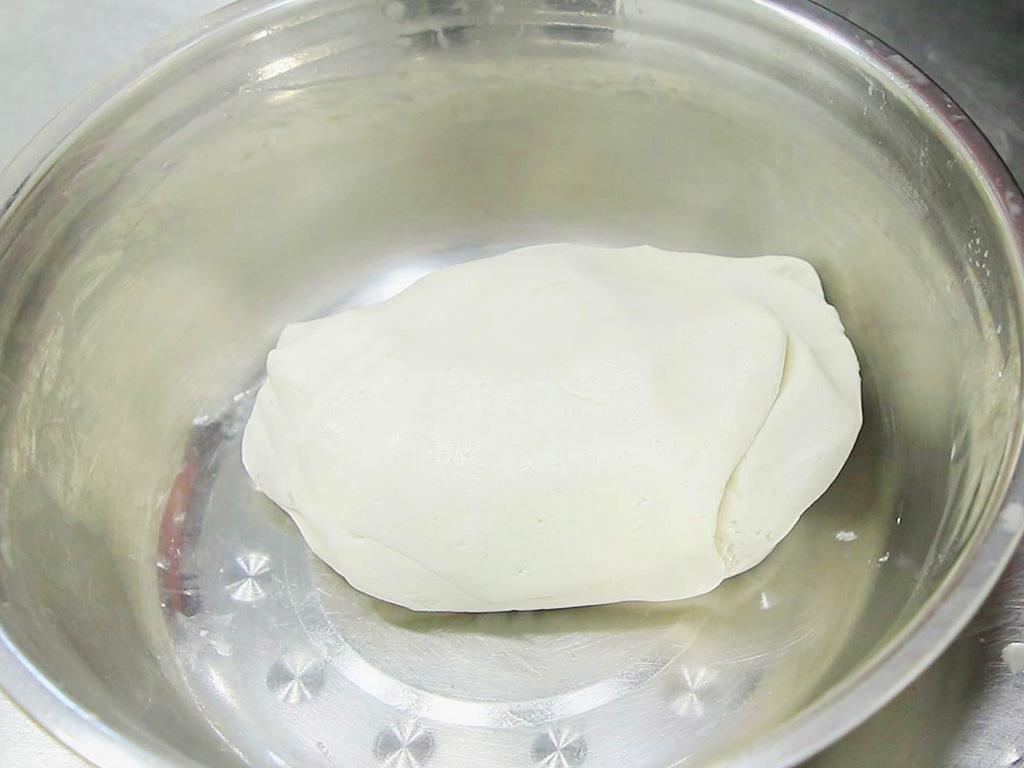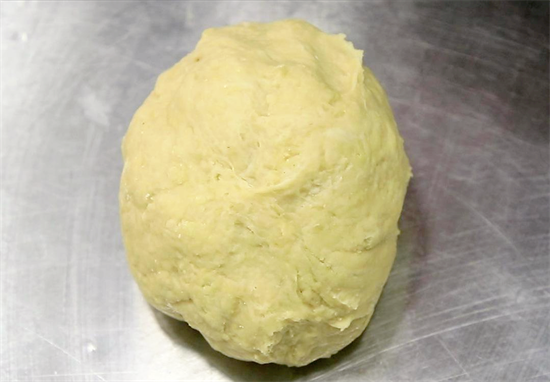 1.准备一个小盆倒入糯米100克、植物油20克,加入开水搅拌成糊状;再倒入糯米粉100克,用凉白开水和面;先和成面絮,再揉成光滑的面团。