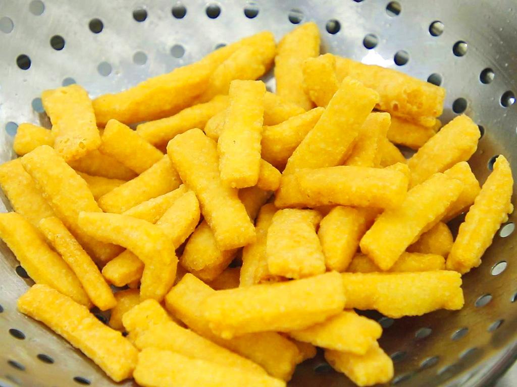 锅内烧油,油面微微冒烟的时候下入糯米条,用勺子轻推防止糯米条粘连。等到糯米条漂起来,且表皮变成微黄色时捞出控油。