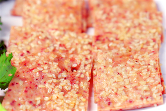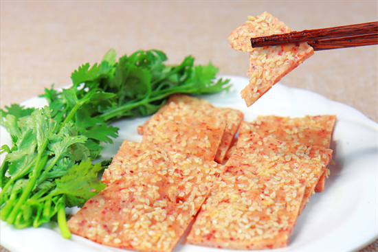10分钟以后猪肉脯就烤好了。把它切成小块,摆放在盘中即可食用,也可以晾上一天,吃的时候更有嚼劲。