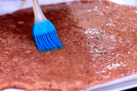 然后把上面的吸油纸拿下来,边缘比较薄的肉泥往里推一推,以免烤糊,在肉泥上面均匀刷一层蜂蜜水,再撒一层白芝麻。