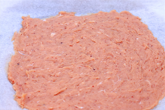 2.然后拿出一张吸油纸,把肉泥挖出来,均匀摊在吸油纸上面,摊好以后用另一张吸油纸盖起来,用擀面杖擀一擀,把肉泥压平整。