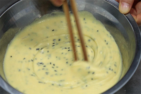 白糖化开以后加入黄油100克边倒边用筷子搅拌,倒入低筋面粉90克,低筋面粉要过一下筛子,筛细一点,搅拌成糊以后加入一把黑芝麻再次搅拌调匀备用。