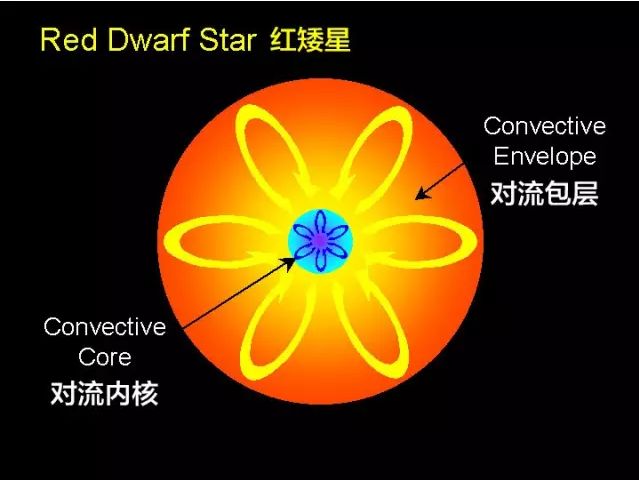 红矮星质量不太够,所以内核到外壳形成了一个对流层 黄矮星和更大质量的恒星,因为质量高,压力大,所以在内核和外部对流层之间有一个辐射层