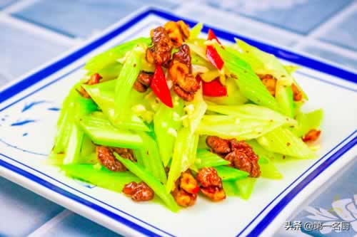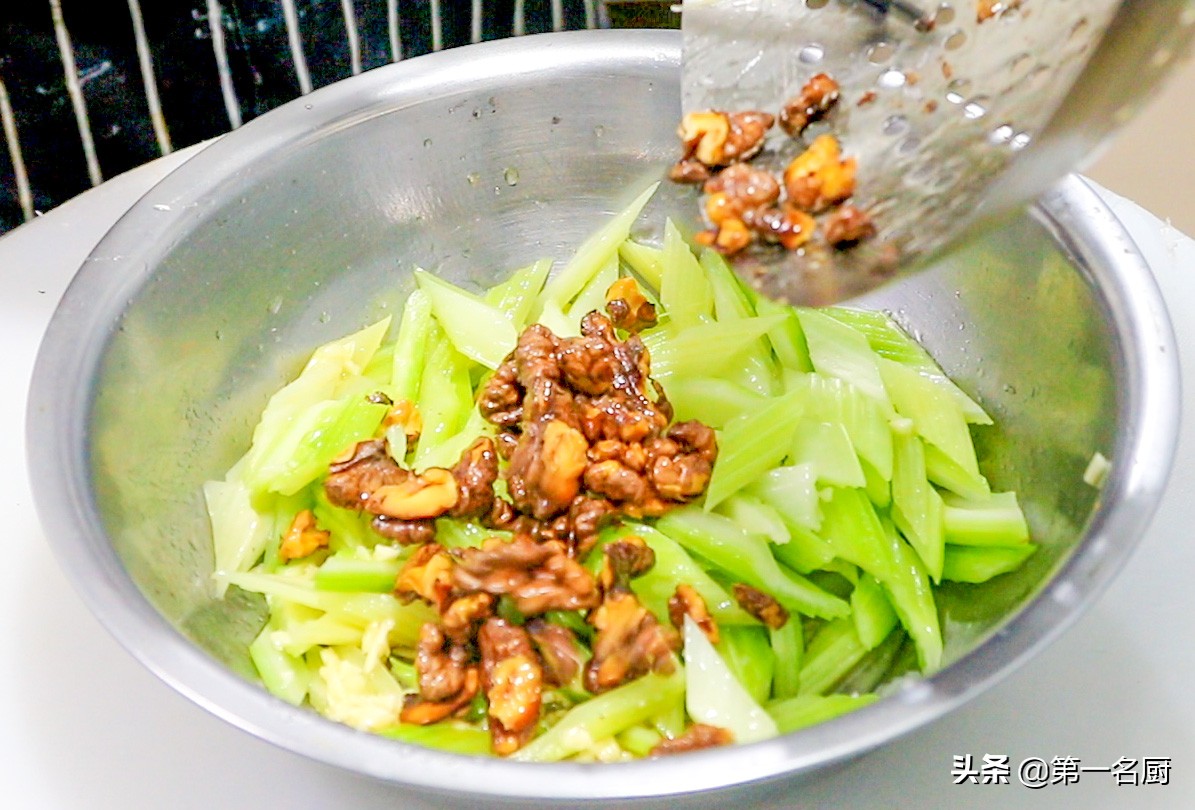 取一个拌菜盆,倒入蒜末,加入食盐2克,味精1克,白糖1克,白醋5克,香油2克,倒入焯水后的西芹和红椒,用筷子搅拌几下,再倒入炸好的核桃仁,颠盆拌匀,美味即成。