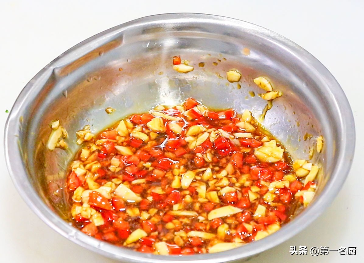 红椒半片切成红椒粒,和蒜末放在一个盆中,加入食盐2克,味精1克,生抽5克,陈醋5克,香油3克,用筷子搅拌均匀,倒入小碗里面备用。