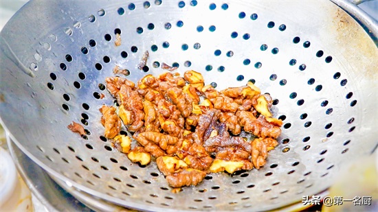 另起锅倒入食用油,把核桃仁凉油下锅,开中小火,用勺子不停地翻炒,炒至核桃仁酥脆即可,这个过程大概需要30秒左右,炸酥以后倒入漏勺中控油。