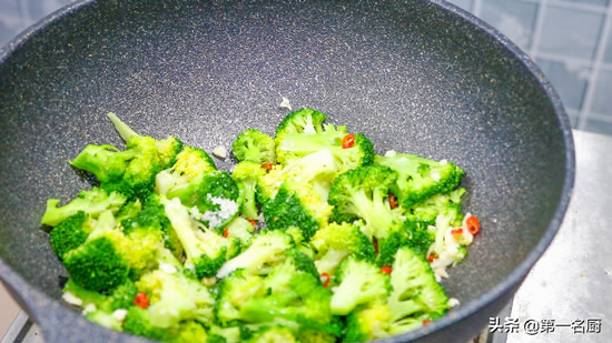 另起锅添入食用油,油热后倒入蒜末和辣椒爆香,炒出香味以后倒入西兰花,快速翻炒几下。