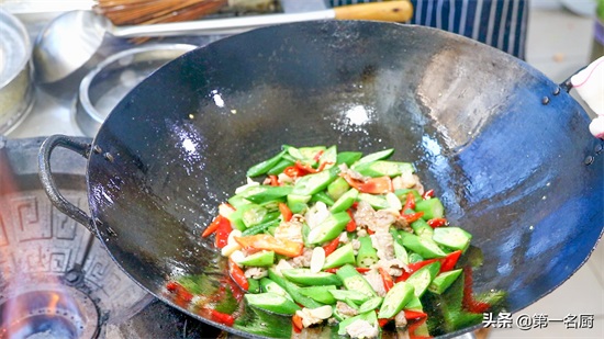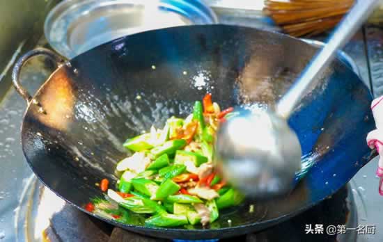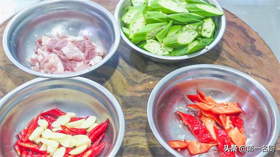 洗净的秋葵一斤左右,切去秋葵的根部,再切成斜片,放入盆中备用,去皮五花肉一两左右,切成薄片,小米椒一小把,洗净后切成斜片,放入盆中。