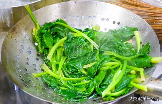 另起锅烧水,加入一勺食盐和少许食用油,水开后下入菠菜叶,焯水一分钟左右,去除菠菜里面的草酸,倒出控水拔凉。