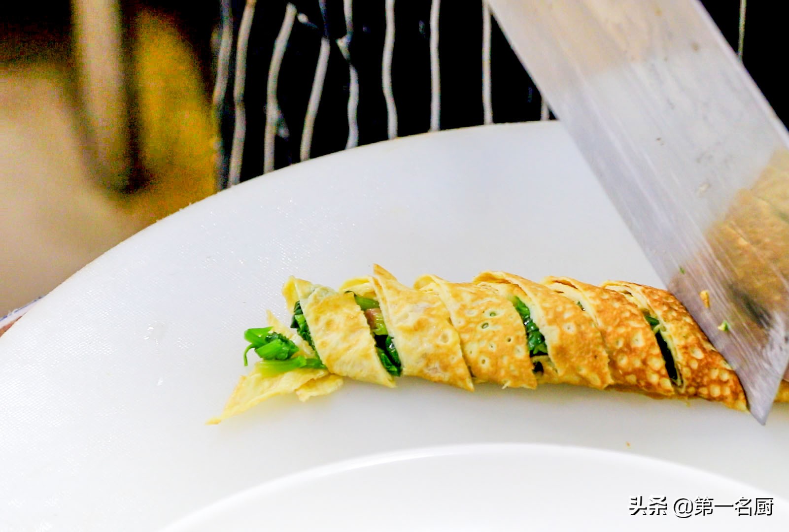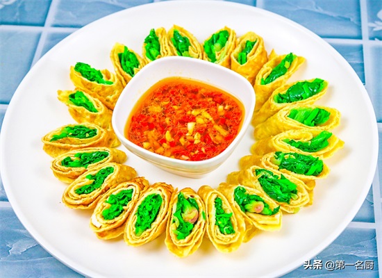 再把鸡蛋皮摊开,放上挤干水的菠菜叶,从一边卷起来,尽量卷实一些,用刀把菠菜鸡蛋卷切成斜段,均匀地摆入盘中,把刚才调好的料汁摆在盘子中间,美味即成。