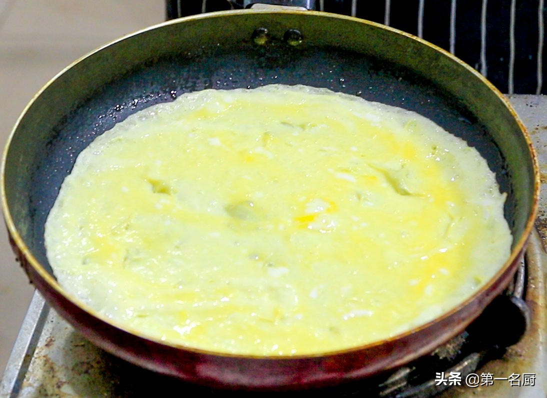 平底锅烧热加入少许食用油,倒入鸡蛋液慢慢摊平,晃动炒锅,把鸡蛋煎熟以后,取出放在干净的菜板上,然后把剩余的鸡蛋液都按这个方法煎好备用。
