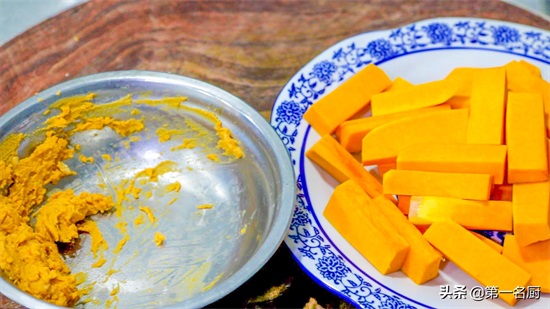 老南瓜半个,先切成四厘米长的段,片去内瓤,削去外皮,再切成长条,放入盘中,煮熟的鸭蛋黄两个,用筷子碾碎备用。
