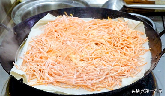 锅中烧水放上篦子,先把水烧开,水开后摊上蒸笼布,放入胡萝卜丝,盖上锅盖,开中火连续蒸五分钟。时间到了掀开锅盖,取出胡萝卜倒入盆中,用筷子抖散,撒上少许食盐,装入盘中备用。