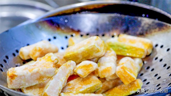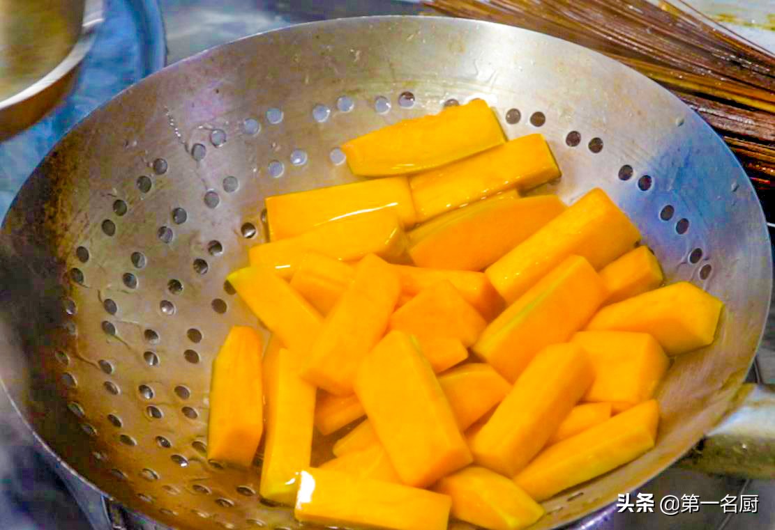 另起锅添入食用油,等油温烧至5成热时,下入南瓜条,用勺子绕锅边推动,改小火炸两分钟,2分钟过后,炸至南瓜金黄酥脆时,即可倒出控油。