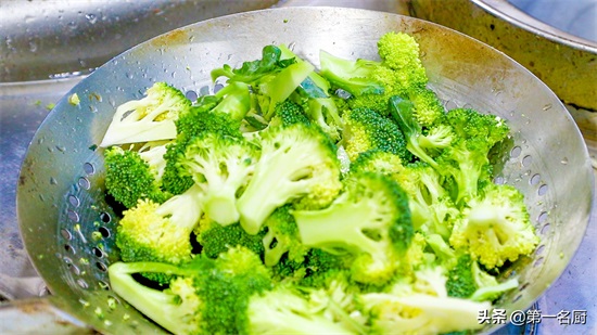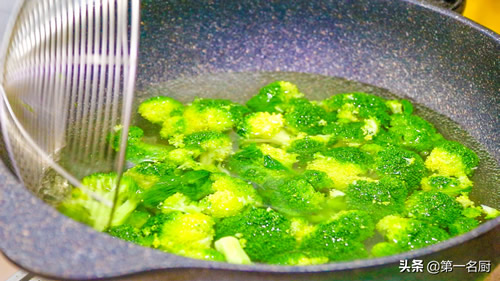 锅中水烧开,加入食盐增加西蓝花的底味,再加入少许植物油,下入西兰花焯水一分钟,捞出控水备用。