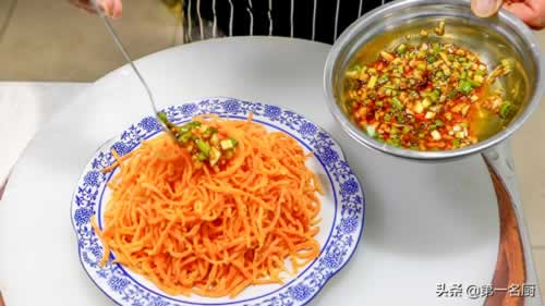 盆里加入食盐1克,味精0.5克,芝麻油5克,红油5克,生抽10克,用筷子搅匀,把料汁浇在胡萝卜丝上面,美味即成,吃起来软嫩香甜,营养又美味。