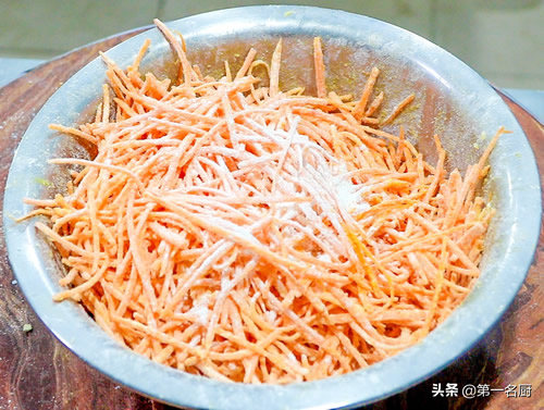 胡萝卜两根削去外皮,切成均匀的细丝,放入盆中,加入少许植物油,用筷子搅拌均匀,锁住胡萝卜里面的水分,面粉适量倒入胡萝卜盆中,用手抓匀。
