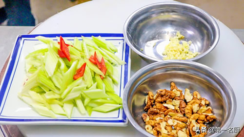 西芹一把撕掉老筋,把宽一点的西芹,从中间划开,再切成菱形块放入盘中,红椒半个切成菱形块,和西芹放在一起,核桃一把,剥去外壳,把果仁放入小盆里面,大蒜几粒,依次拍扁切成蒜末,放入盆中备用。