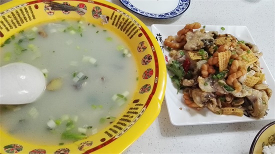 这家店名很特别的"抿尖饭店"做的一鱼两吃,鱼头尾熬汤,鱼肉片加葱姜、红椒、花生米、小麻花一起油炸,很好吃。