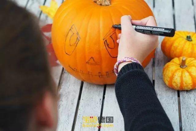 在南瓜外壁画出自己想要的图案,或者在网上找寻心仪的图案照着画,如果是初次制作的话最好画简单一点;