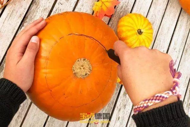 用笔先在南瓜顶部绘制出盖子的形状(圆形或锯齿形),注意要用小刀倾斜着切入切开,防止完成后盖子掉入南瓜内部;