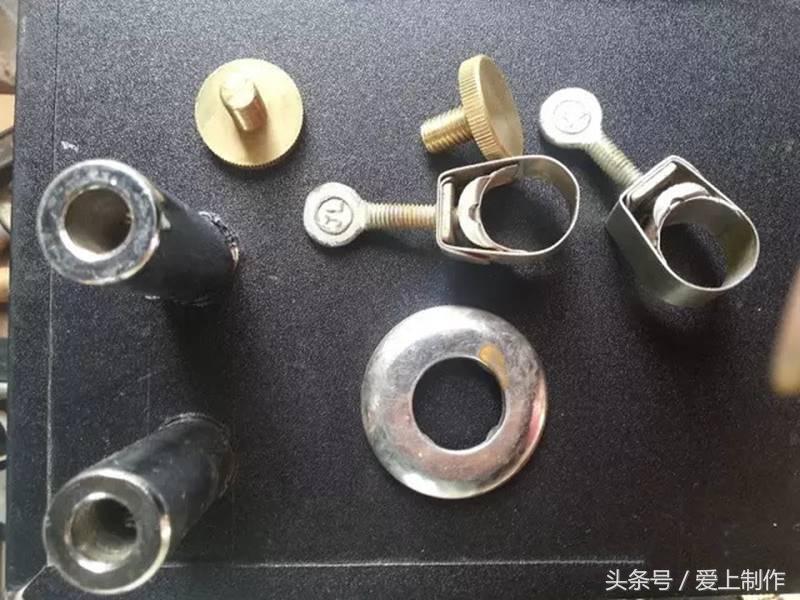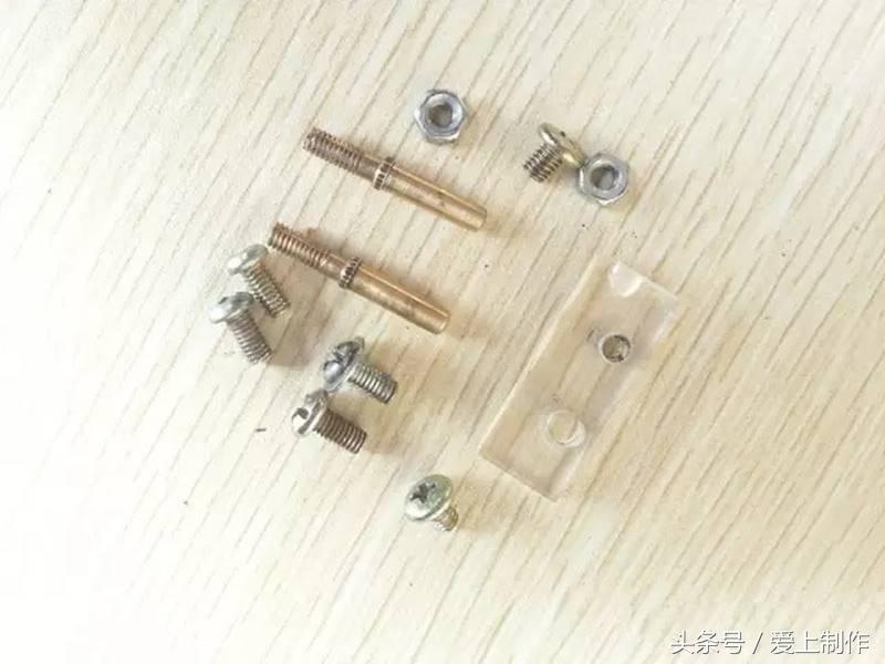 3、一小块废弃亚克力,废弃的老式插头内芯铜棒2只,还有一些不同规格的螺丝(螺丝取材废弃物本身的材料,所以规格有点小差异)