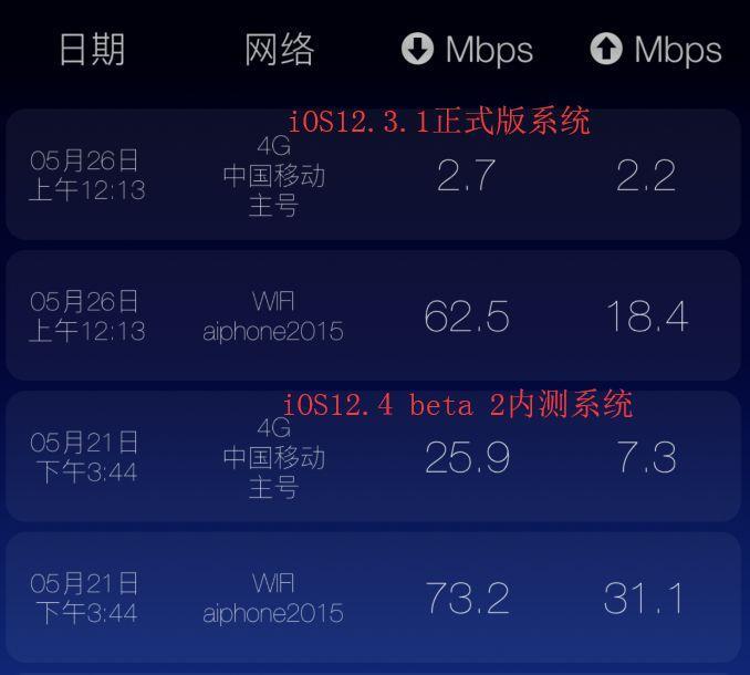 使用Max 国行版设备,系统版本为iOS12.3.1,测试软件叫:测网速,上次测速与本次测速对比,iOS12.3.1 较差,本数据只作参考,并没有准确数据。