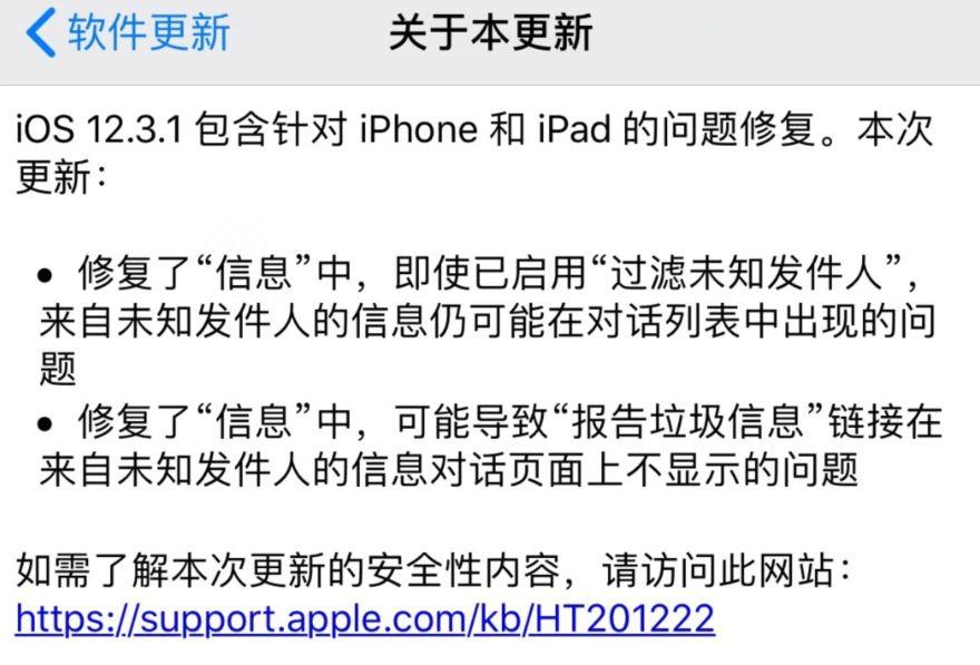 简单说:主要修复信息“过滤未知发件人”功能,如果不想接收到这些信息,你可以升级到iOS12.3.1系统,小编觉得没必要,还是等等iOS13 beta 系统,毕竟还有 8天 时间,你觉得呢!已经升级了iOS12.3.1系统的用户,请在文章底部评论区回复,告知升级后,手机是否出现发烫、耗电、卡顿等情况,给未升级的用户作参考。