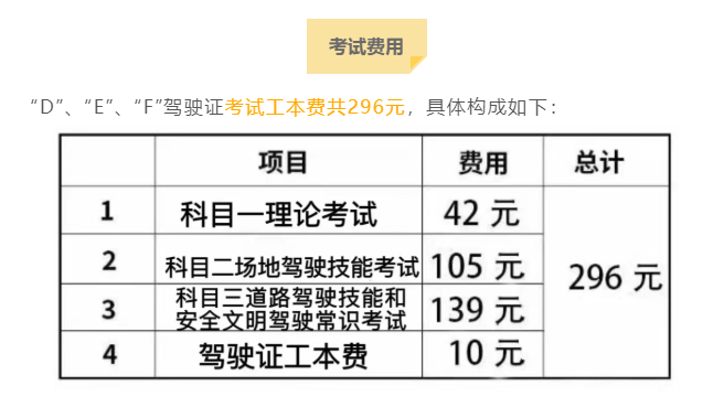 考试费用:E/F驾照考试费用也差不多,直接到车管所考试的话,一般在300元左右,如果需要培训,那么价格在800~1000元左右。