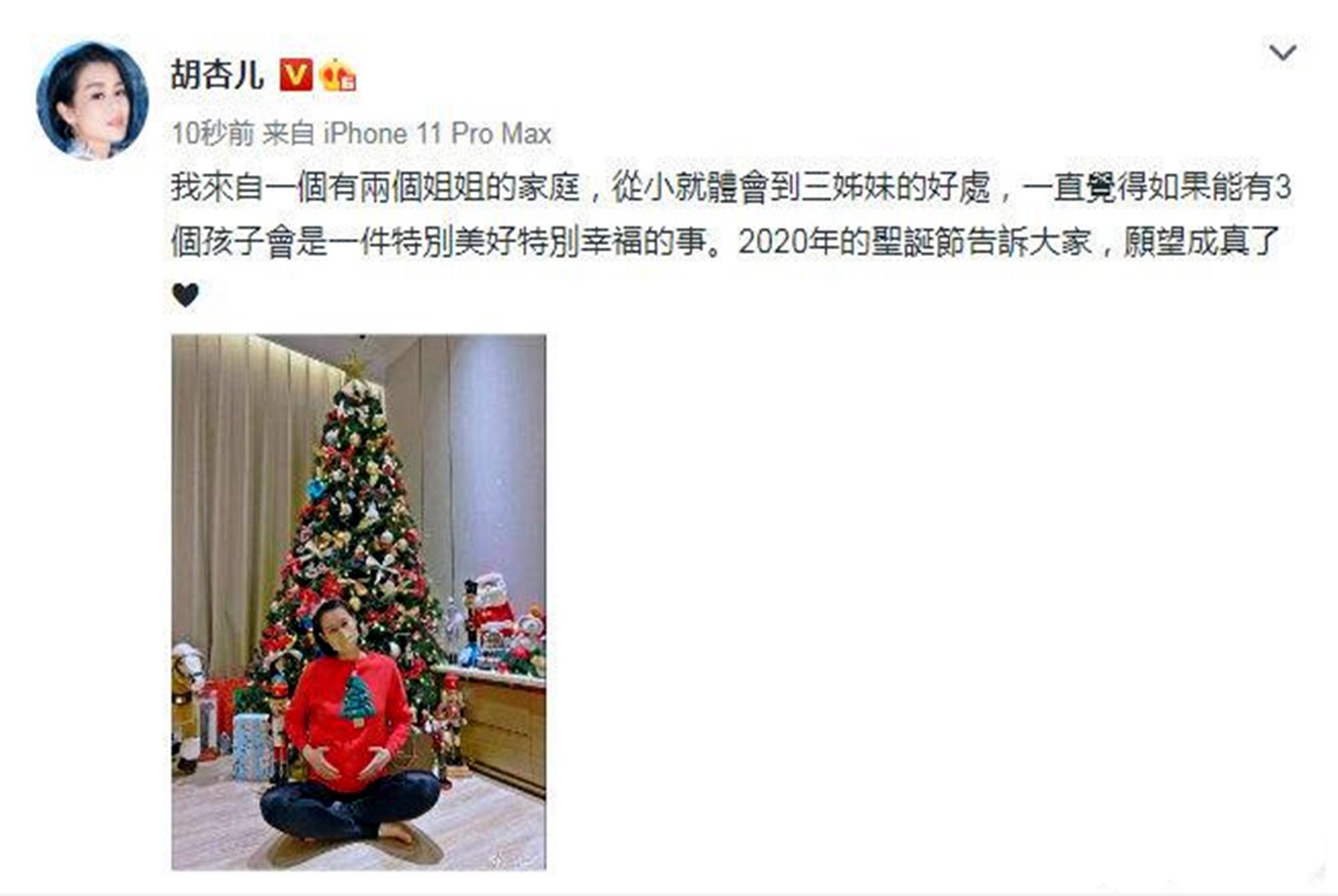 胡杏儿是一个妥妥的拼命三郎,在怀孕期间,还参加了《演员请就位》并且一举拿下冠军。在圣诞节前夕,胡杏儿发文称,自己上面有两个姐姐,特别享受姊妹多的快乐,也曾想着自己能够有三个孩子,终于实现了这个愿望。可见,胡杏儿对三胎特别期待。