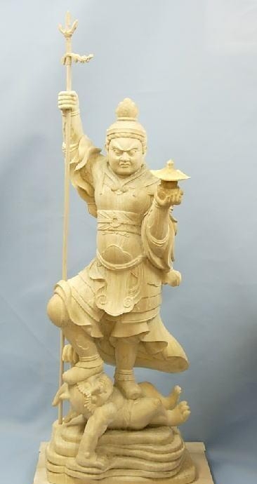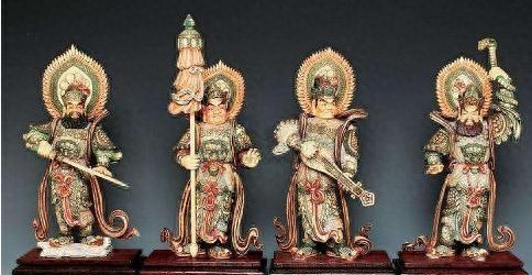 我们去佛教寺庙里参观游览时,在第一重佛殿里能看到四大天王的塑像,他们模样相似,肤色鲜艳,各个手持不同的法宝,横眉瞪目,表情夸张,与寺庙里其他危襟正坐的佛像比起来更为有趣。