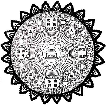 佛教经典记载,世界的中心是须弥山,此山无比巨大,由金、银、琉璃、水晶四宝构成,高约110万公里。在须弥山的四周环绕着四大部洲,即东胜身洲、南赡部洲、西牛货洲、北俱芦洲。在须弥山腹有一座小山,名犍陀罗山,此山有四山头,各住着一位天王,各护一部州。