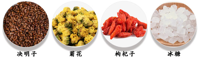 材料:决明子、菊花、枸杞子、冰糖均适量;