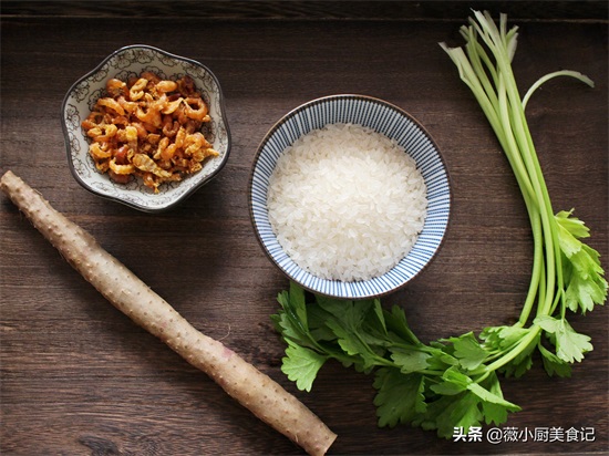 [食材]:虾米一把,山药一根,香芹2颗,大米一碗,橄榄油少量