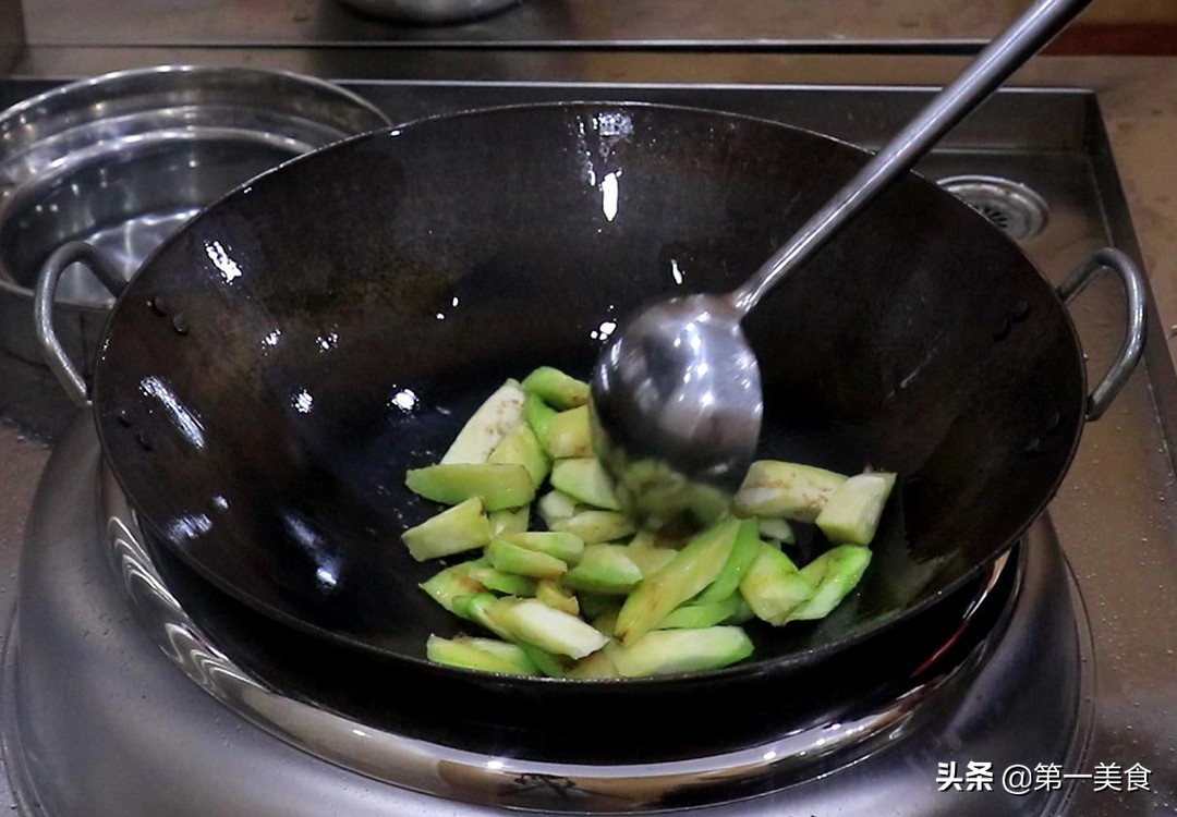 ,先倒入一半的茄子,开中火煎2分钟左右,经常翻面让茄子均匀受热,茄子煎软煎成金黄色时倒出来,再把剩余的茄子也按此方法煎好备用。