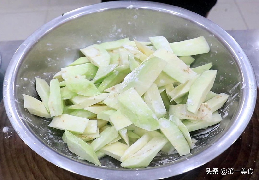 准备青茄子一个,把外皮刮干净,先切成厚片再切成菱形块,切好以后在茄子上面撒一些淀粉拌匀,淀粉不要放得太多,薄薄的一层即可,