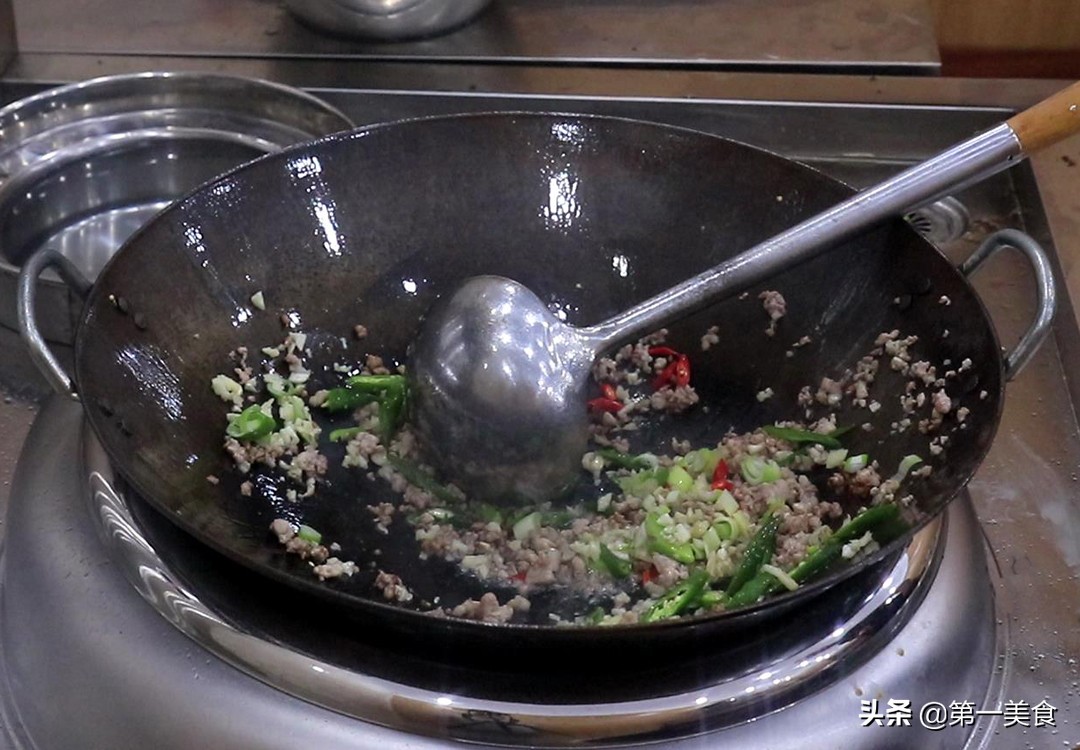 锅内再烧油,油烧热以后,倒入肉末快速炒散、炒出肉末中的水分,肉末炒香以后,倒入青红椒和葱、姜、蒜一起翻炒,炒出香辣味。