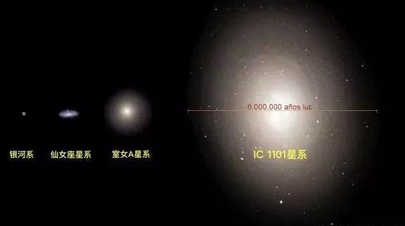 IC1101星系的直径在420万光年左右(一说达600万光年),是银河系直径的27倍左右,它的体积能够装下约2万个银河系,就是银河系和仙女座星系加起来的规模,IC1101,也能装下上万个。如果IC 1101位于我们银河系所在的本星系群的中心位置,那么将银河系、仙女座星系、三角座星系和大麦哲伦星系、小麦哲伦星系等都将位于这个星系里面。要知道,我们的银河系距离仙女座星系有254万光年,距离三角座星系有近300万光年。