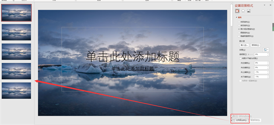 当我们创建了更多幻灯片后,如要将图4步骤的背景图应用到所有幻灯片中,单击“设置背景格式”底部“应用到全部”便能全部应用。