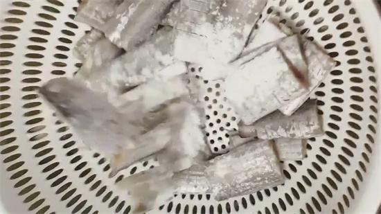 1、首先,准备1-2条新鲜的带鱼,先将它们头尾两端去掉,再将中段部分改刀剁成长短一致的小段,然后,再在它们两面划拉上2-3刀(状态如上图所示即可),再给它们均匀地包裹上一层薄薄的玉米淀粉(直接把它装入漏兰中,这样比直接上手抓拌来得更轻松),全部弄好后,放在一旁备用。