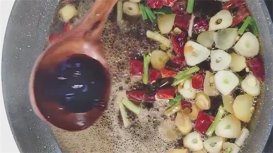 3、二次起锅烧油,油热后,把适量的葱段和蒜片爆香后,再倒入少量的干辣椒,炒出辣味后,再加入1罐啤酒,汤汁烧至冒泡后,再添入1勺生抽,1勺蚝油,1勺陈醋,以及少许的盐、胡椒粉、白糖调味,继续烧1-2分钟。