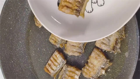 2、锅中放入少许的底油,油烧热后,再将裹好淀粉的带鱼段逐片夹入进去,记住务必开小火慢炸(浸炸效果更好,但是油耗较大),直到把它们炸至两面金黄焦脆为止捞出,沥干油分后,盛入盘中(务必保持干燥状态)备用。