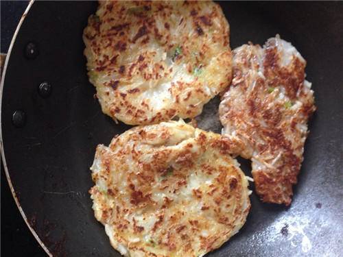 步骤3:在锅中倒入油,在烧热锅之后就将山药糊下锅,然后开始煎,在一面定型之后就用锅铲翻个面,煎另外一面,也定型之后就再次翻面,接下来就不断的翻面,直到成为金黄色就出锅。可以同时几个一起煎,全部煎好之后就上桌吃。