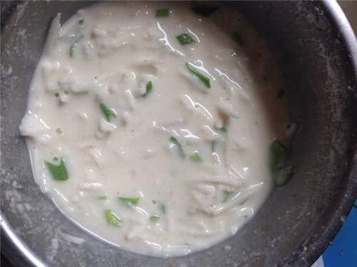 步骤2:接着拿出葱,来回冲洗几遍,然后将葱切成段放在一旁备用。紧接着拿出面粉,将面粉倒入山药中,然后加上水开始搅拌,快速的将它们搅拌均匀之后就倒入葱花,最后拌匀之后就可以备用了。