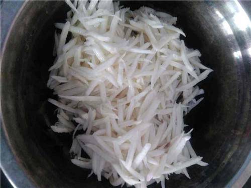 步骤1:拿出山药,接着在手上套上袋子,然后开始用刮子将山药的皮刮掉,紧接着将山药放在流水下冲洗,等到洗干净之后就将山药放在菜板上,接着用刀将山药切成丝,放在碗中备用。或者直接用擦丝的工具擦丝。