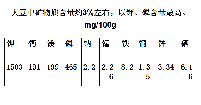 除了含有丰富的蛋白质外,大豆中还含有很多矿物质,其矿物质含量约3%左右,以钾、磷含量最高。