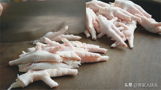 第一步:准备的鸡爪提前浸泡好,再把它冲洗一下,洗好后,再把鸡脚上的指甲剪掉,因为指甲比较脏,而且吃的时候容易刺到嘴。指甲剪完后,再把鸡脚一分为二剖开。