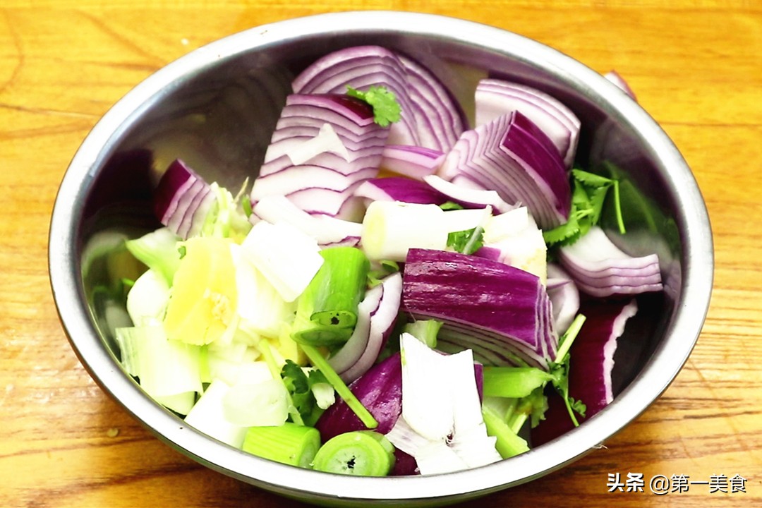 3.辣椒面介绍完之后,重点就是油,做辣椒油用平时吃的植物油可不行,最好是葱油。大葱拍散、切成圈,芹菜切断;洋葱切成块;香菜切成段、香菜根一定要留着;生姜拍散、切成片,榨葱油一般都少不了本身自带香味的洋葱、芹菜、香菜等这一类食材 ,香菜要单独放在一边备用。