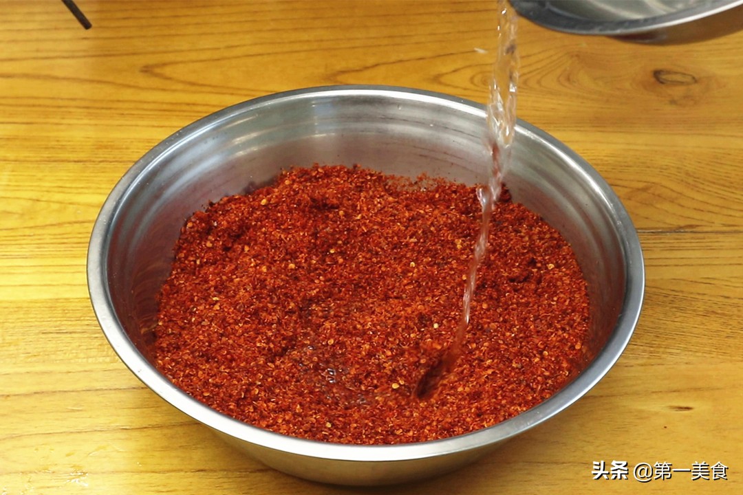 4.把刚刚准备好的辣椒面一起倒在大盆里面,淋入一些高度白酒,加入一勺食盐搅拌均匀,白酒能够充分激发出辣椒的香味和辣味,然后再淋一点清水拌匀,这样后期激油的时候辣椒面不容易糊。